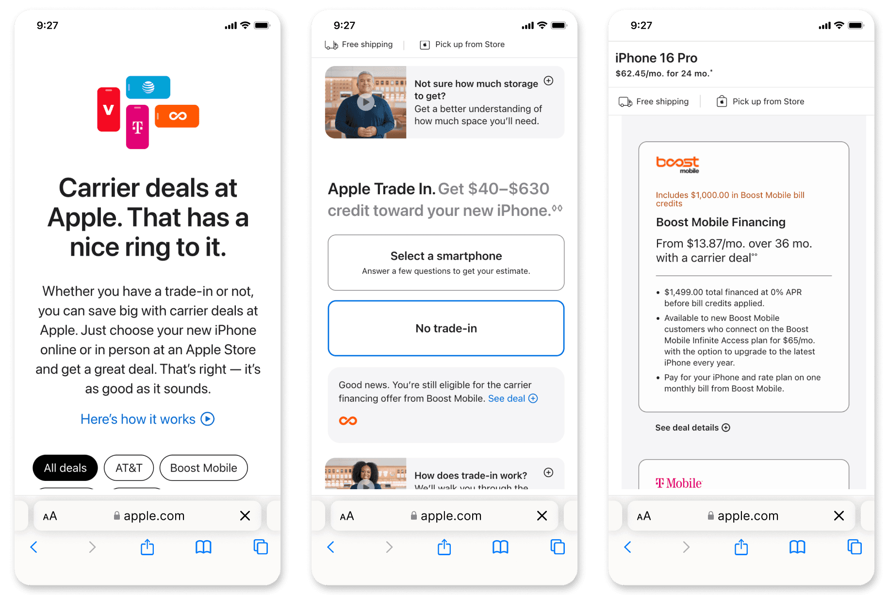 This high-impact project optimized key mobile web touch points, including a carrier financing landing page redesign and trade-in step update on the iPhone product page.